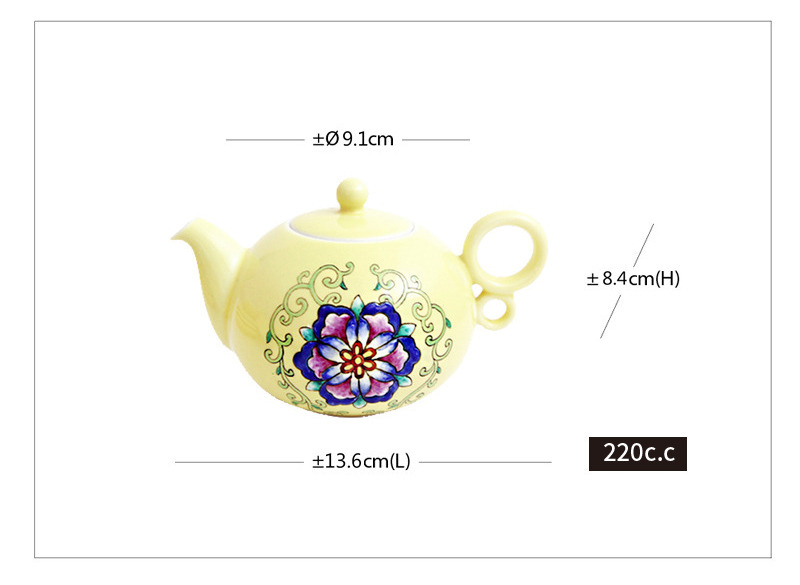 這組茶具組以柔和的淡黃釉為主色,搭配手工彩繪的團花圖案,展現典雅與活潑兼具的氣質。